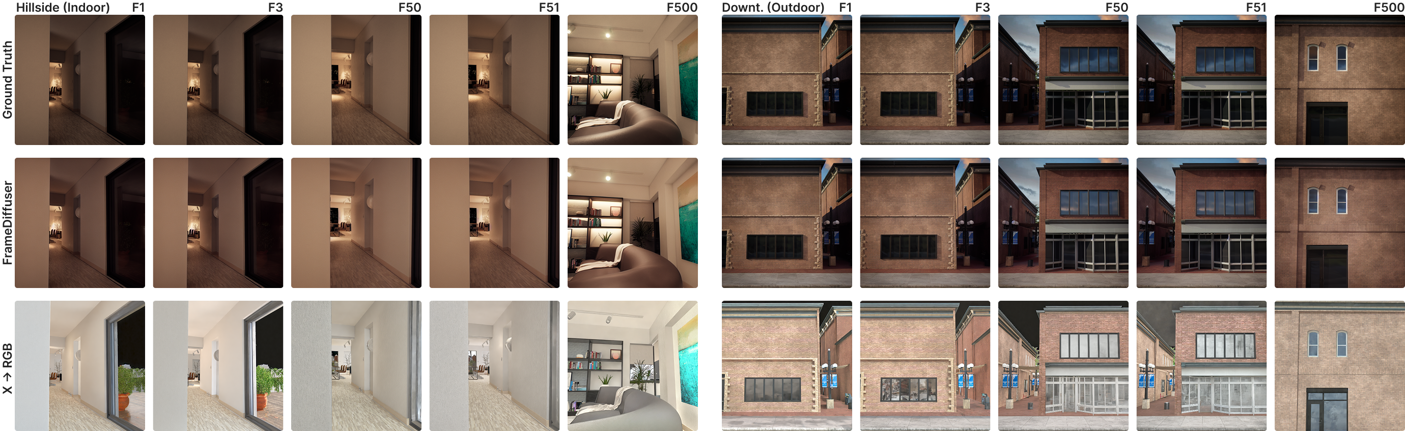 ComparisonCompared to X→RGB from RGB↔X, our method achieves more realistic lighting with high-detail illumination while maintaining temporal consistency across frames over long sequences. X→RGB produces images that appear artificially flat with uniform lighting, lacking the rich lighting variation, shadow depth, and atmospheric effects present in photorealistic rendering.