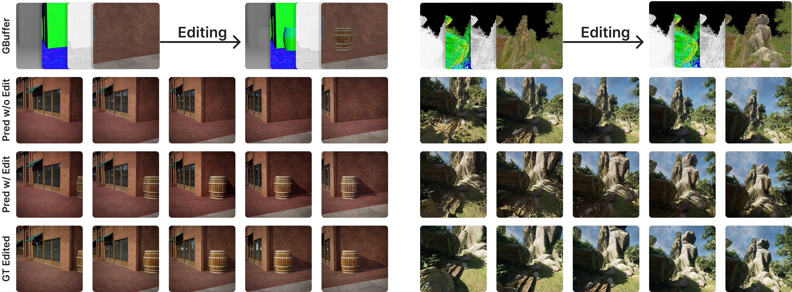 Scene EditingWhen objects are added to the scene through G-buffer modifications, FrameDiffuser automatically synthesizes appropriate lighting, shading, and cast shadows. This enables artists to maintain full control over scene composition while FrameDiffuser handles the computationally expensive lighting synthesis automatically.
